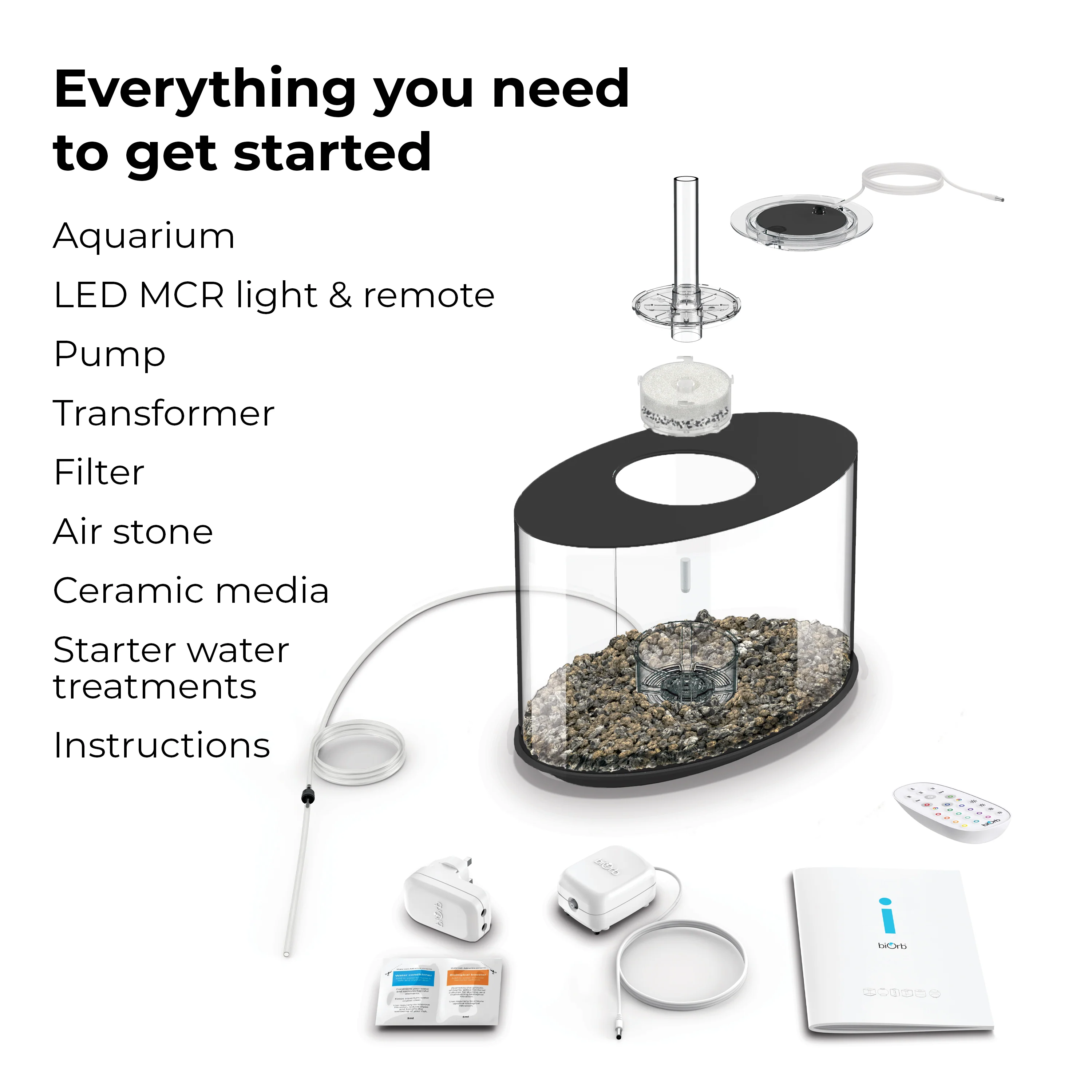 Aquarium, air pump, LED lighting, remote control, transformer, water treatments, air stone, filter cartridge, ceramic media, MCR remote control, and instruction manual